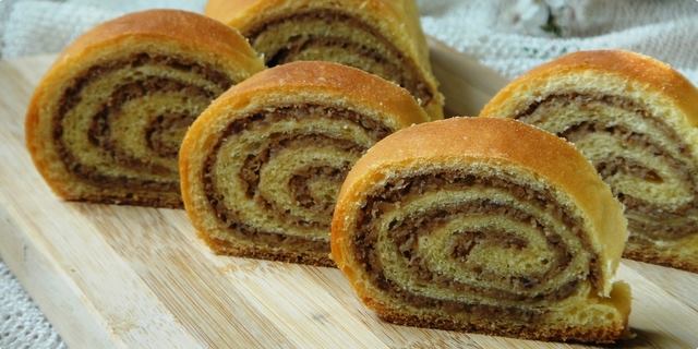 Kad se tijesto diglo, razvaljati ga valjkom i namazati nadjevom po želji. Ja sam ovaj put imala samo orahe. Razvaljala sam tijesto na dimenziju dugačkog valjka i namazala filom kao na slikama. Lakše je rolati sa svake strane i kasnije prerezati po sredini da se dobiju 2 štruce. Ja sam još i te prerezala pa sam dobila 4 male. Prebaciti ih u namašćenu tepsiju (ja koristim maslac ili margarin)