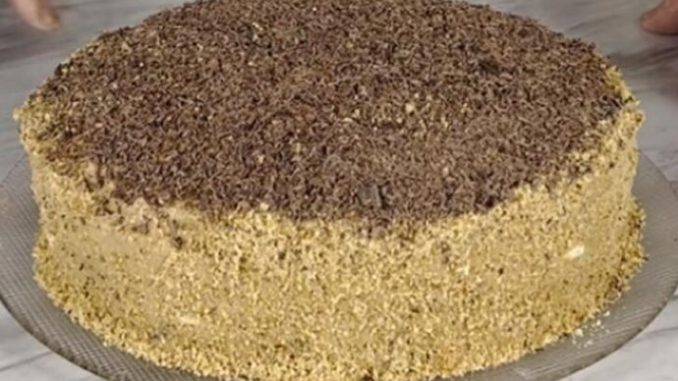 Sipajte u pleh i pecite. Ispečenu koru ostavite sa strane. Tako napravite još dvije kore. Ukupno treba da bude 3 korice za tortu.