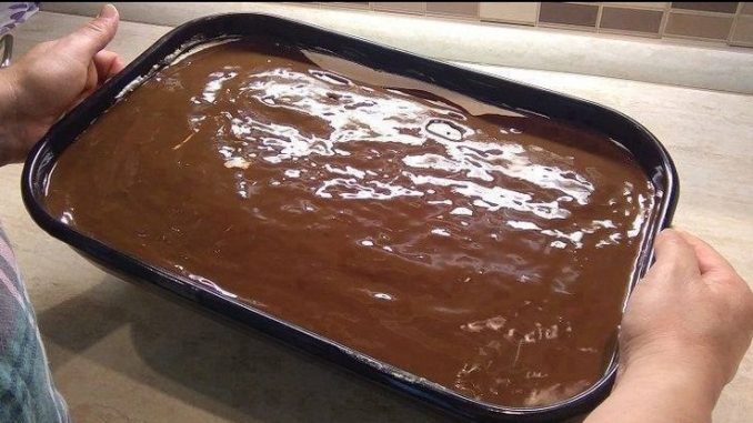 Kada je kuhan puding, izlomiti čokoladu i izmješati da se otopi, vruću kremu sipati odmah preko kore i pustiti kolač da se skroz ohladi na sobnoj temp.