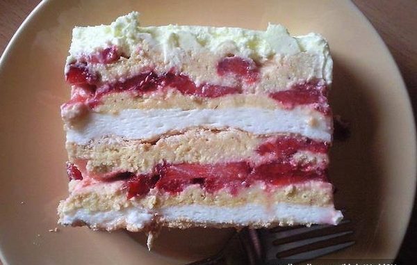 Na koru staviti pola fila, zatim isečene sveže jagode, drugu polovinu fila i odgore umućen šlag.