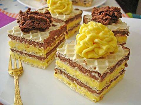 Naizmenično ređati listove oblandi i filove. Petu, poslednju oblandu pritisnuti rukama da se fil zalepi. Staviti tacnu preko i ostaviti da se stegne. Iseći na kocke. Ostatkom filova napuniti špriceve i ukrasiti sečene kocke.