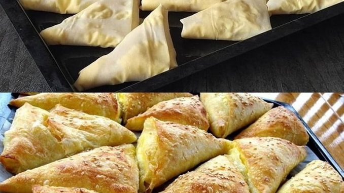 U kut stavite sir i lagano ga preklopite, podsjećajući na uši tegle tijekom izrade. Nastavite sa uvijanjem i preklapanjem kore da dobijete trokutasti oblik.