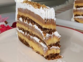 Nedostatak fila u ovoj torti nadoknađuje se sočnim prelivima koji lako upijaju koru. POTREBNI SASTOJCI: Da napravite koru: Dva jajeta. Mera od deset kašika punjenih […]