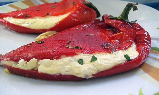 Pećnicu zagrijte na 200 stupnjeva. Paprike operite pa ih nožem razrežite po sredini, tako da peteljka ostane netaknuta, te im izvadite sjemenke. Nauljite vatrostalnu posudu, složite paprike pa ih pecite