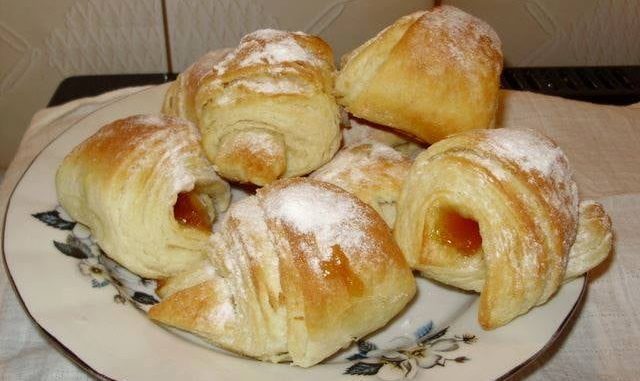 U to staviti uzašli kvasac i polako dodavati brašno da dobijete mekano tijesto (ne premekano).Ostaviti da udvostruči obujam, razvaljati i mazati samljevenim salom(može i margarin) i tijesto preklopiti kao za lisnato tijesto. Ostaviti da miruje pola sata. Sve ponoviti još dva puta. Nakon toga razvaljati, rezati na trokute, na svaki trokut staviti malo marmelade, zaviti i ostaviti kifle da narastu pa staviti peći na 200 stupnjeva.Pečene posuti šećerom u prahu. Kad mi nestane sala kojeg uvijek stavim u zamrzivač da imam u toplijim danima zamijenim ga margarinom.