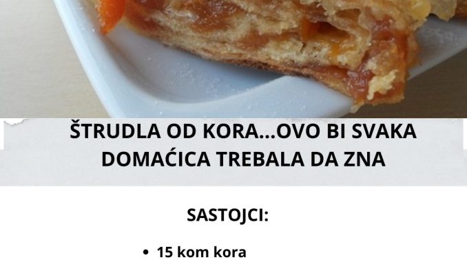 Svaku koru premazemo sa nekoliko kasika fila, redjamo jednu na drugu a na poslednju, petu, po celoj kori stavimo nadev. Zatim urolamo strudlu, malo podvijemo krajeve da fil ne iscuri i stavimo je na pleh u koji smo stavili papir za pecenje ili podmazan pleh.Isto uradimo i sa ostalim korama pa premazemo strudle ostatkom fila.