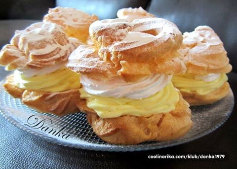 Ohlađene krofne rasjeći na pola stavljati kremu pa slatku pavlaku umućenu u šlag i poklopiti gornjim dijelom krofne.